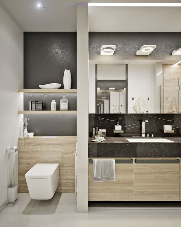 4.Bố trí ánh sáng và màu sắc: Chọn màu sắc và ánh sáng phù hợp để làm cho không gian nhà tắm trở nên rộng rãi và thân thiện hơn. Tận dụng ánh sáng tự nhiên hoặc lắp đặt các điểm sáng nhân tạo chiếu sáng đều khắp không gian, đảm bảo ánh sáng đủ và phân bố đồng đều.
